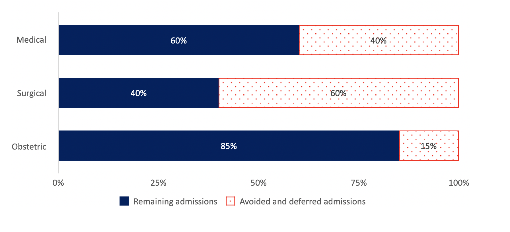 The admission rate for medical cases has declined by more than 40%. This is more surprising as medical admissions are not typically elective and admissions cannot usually be delayed. For example, one does not choose to develop a pneumonia or gastroenteritis that is severe enough to necessitate an admission.